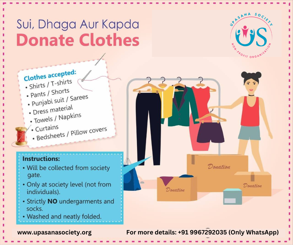 Join us this Lord Ganpati Festival in a heartwarming initiative by Upasana Society NGO, as we embark on the Sui Dhaga Aur Kapda Campaign 2023. Our goal is to donate 5000+ kgs of clothes and empower individuals from various underprivileged backgrounds in Mumbai and its vicinity.